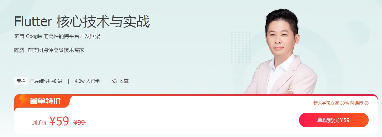 在这个课程里,陈航将通过对比其他框架的特性,着重为你剖析 Flutter 的核心知识点和背后原理,以及一些常见问题的解决思路。让你在既有终端技术栈的基础上做能力叠加,而非从零开始学习 Flutter,沉浸在 API 的参数和实现细节中。