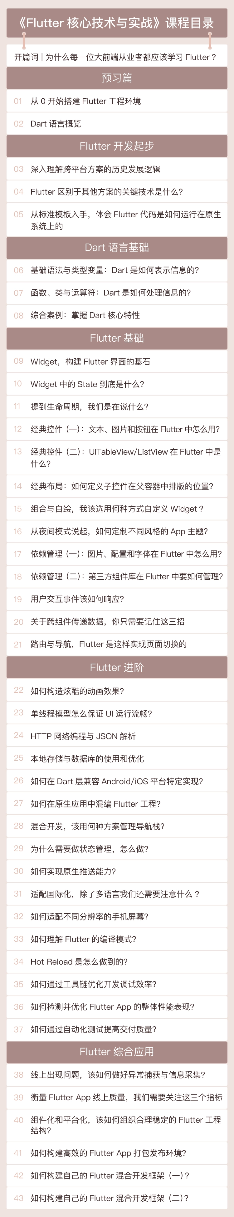 - Flutter 开发起步模块,从跨平台方案发展历史出发,与你介绍 Flutter 的诞生背景、基本原理,并带你体验一下 Flutter 代码是如何在原生系统上运行的。