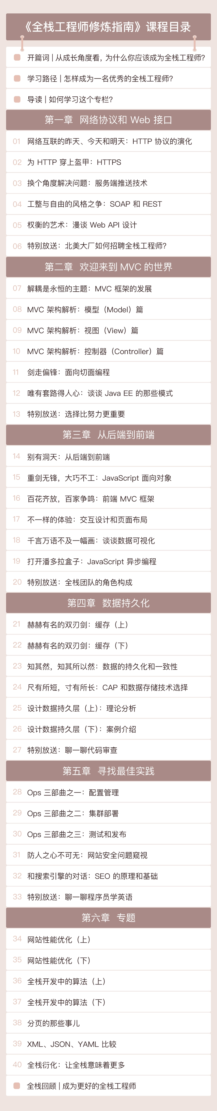 本课程将重点解决以上问题,聚焦基于 Web 的全栈技术,围绕“网络协议、MVC 架构、前端技术、持久层技术”等核心领域,梳理学习路径,对比剖析代表性技术,立足最佳实践、实战专题,带你全面掌握全栈技能。