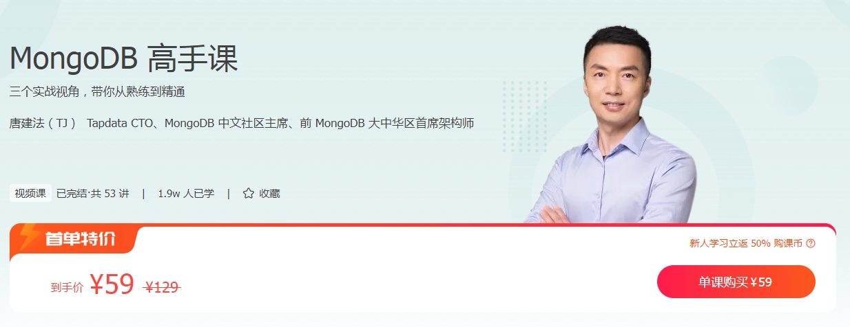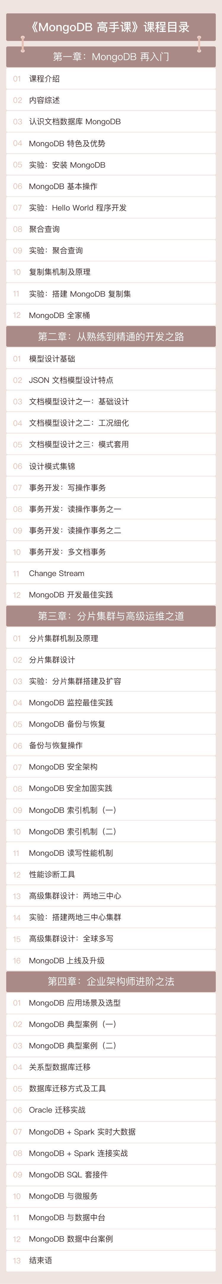 在本课程中,唐建法老师基于过往给海内外头部客户主导设计大型 MongoDB 架构的经验,采用最新的 MongoDB 4.2.1 版本进行讲解,帮你掌握更高阶的 MongDB 开发及运维管理技巧,以及两地三中心、数据中台等典型架构的设计方法和原则,带你从初级 MongoDB 使用者成长为专家级 MongoDB 用户。