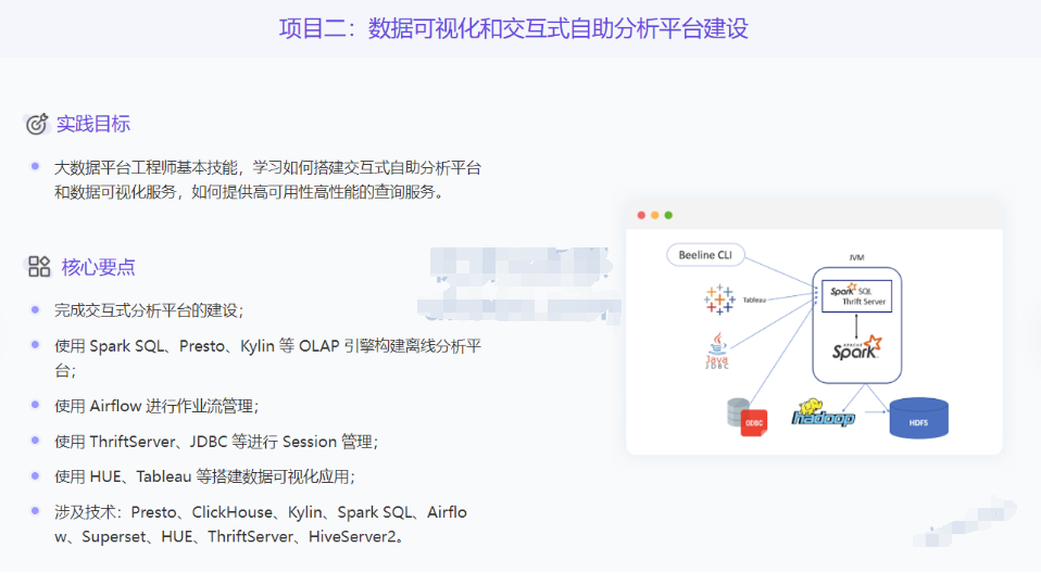 实战项目包含:Hadoop集群和健康管理、搭建数据可视化交互与分析平台、使用Spark对商城平台用户数据分析