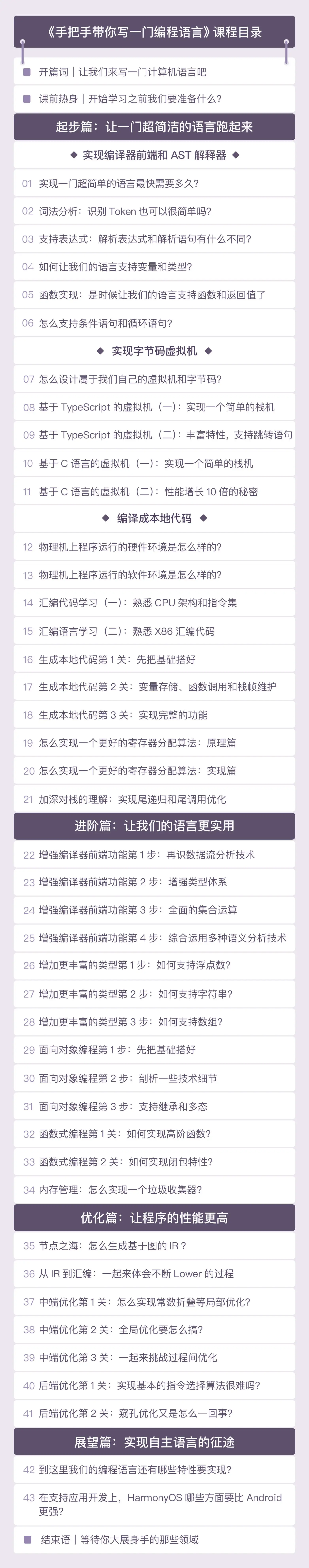 展望篇:实现自主语言的征途。这一模块,我们会展望一些更高级的语言特性,比如并发、自举等,让你理解更高阶的思路和实现方法。