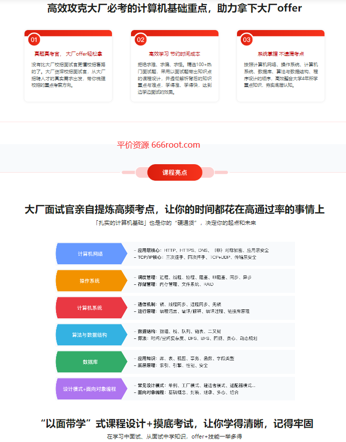 对大多数人来说,校招,是相对容易进大厂的机会,也是奠定职场生涯的重要起点。本课程针面试环节必考计算机基础部分设置,从计算机网络、操作系统、计算机原理、算法与数据结构、设计模式、数据库等经典基础知识,到初次求职的软技能,快速提升大厂重视的后端素养,斩获心仪校招offer。