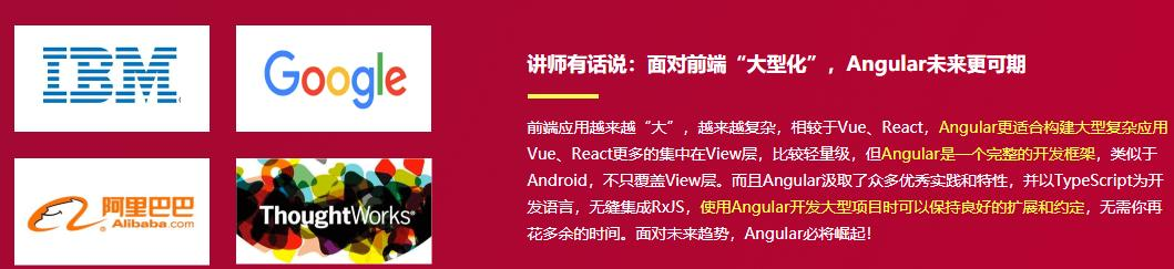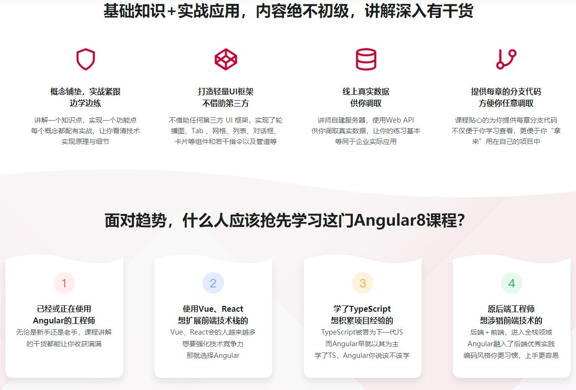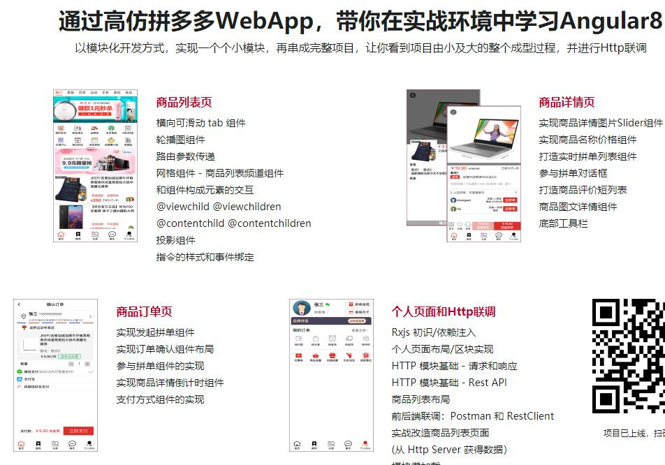 新版的框架,火爆的项目,酣畅的实战,带你收获满满的干货,你会发现,其实Angular并不是像传闻说的那样“很难”,相反,你会发现Angular的很多思想是非常领先的,课程从基础开始,但并非浅尝辄止,会为你呈现一个完整的Angular 学习路径