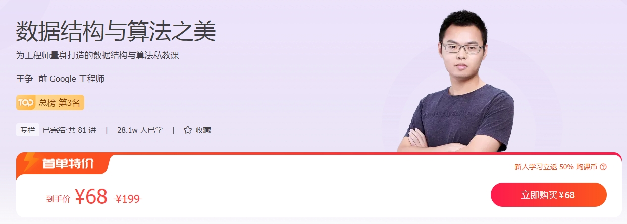 踏上了编程之路,也就意味着你选择了一种终身学习的生活方式。每一个程序员都要练就十八般武艺,而掌握数据结构与算法就像修炼了九阳神功。换句话说,掌握了数据结构与算法,你的内功修炼速度就会有质的飞跃。