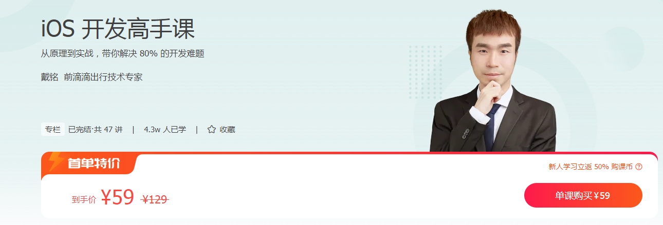 在这个课程里,戴铭将会结合自己的成长经历,为你梳理出 iOS 开发的核心且重要的知识,以遇到问题解决问题的方式带你深度理解这些知识,紧接着通过底层原理的讲解,帮助你能够主动出击,建立从源头消灭问题的能力,最终引导你将各类知识贯穿起来,进而形成一套核心且有深度的知识体系,彻底搞懂 iOS 开发的方方面面。